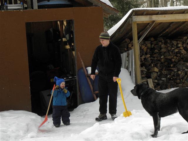 Then Samuel played with Kirk’s old red shovel. Grant used Samuel’s yellow shovel to throw snow “up” for Boots who jumped for it. “Up” was a lot of fun.